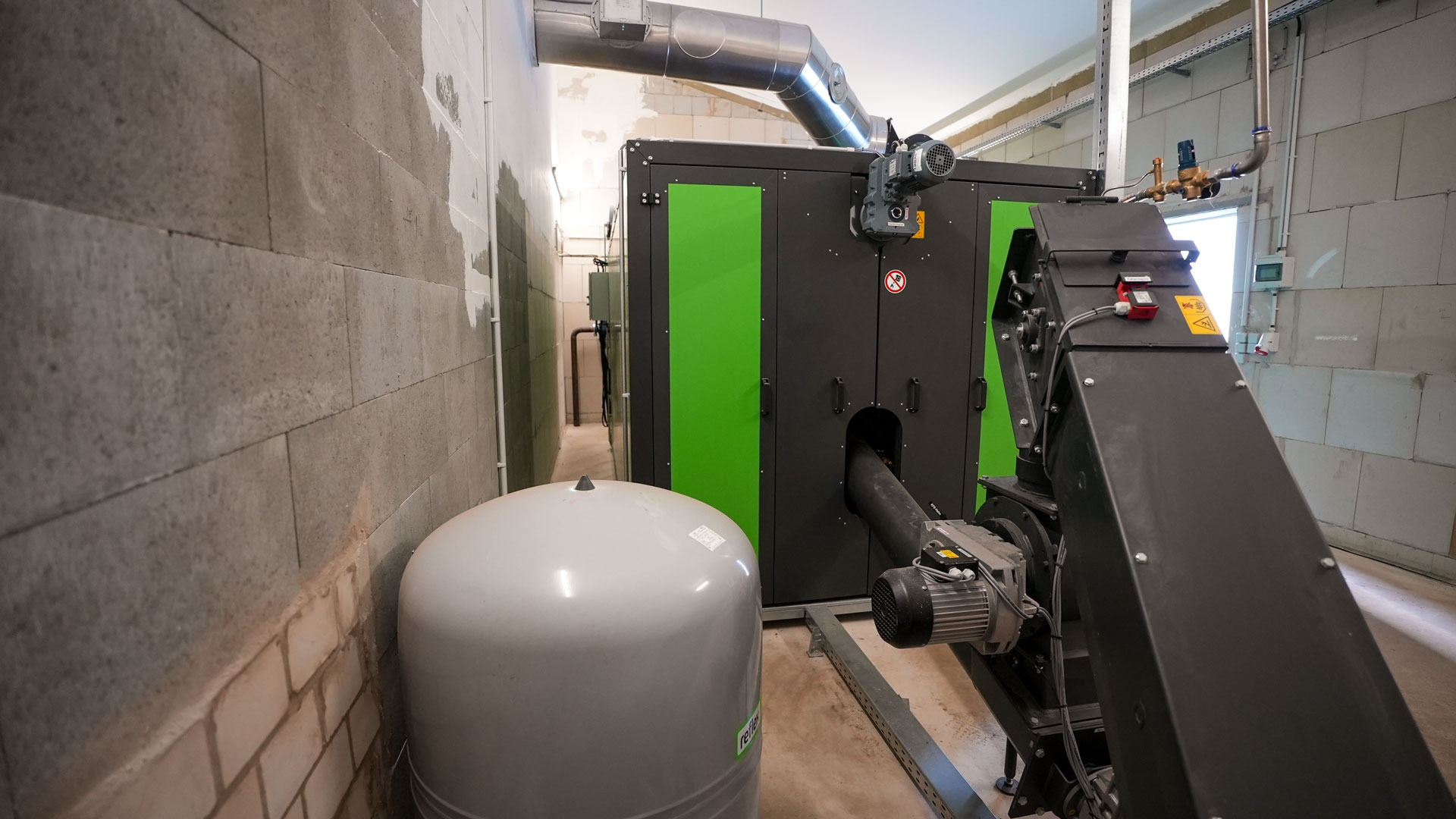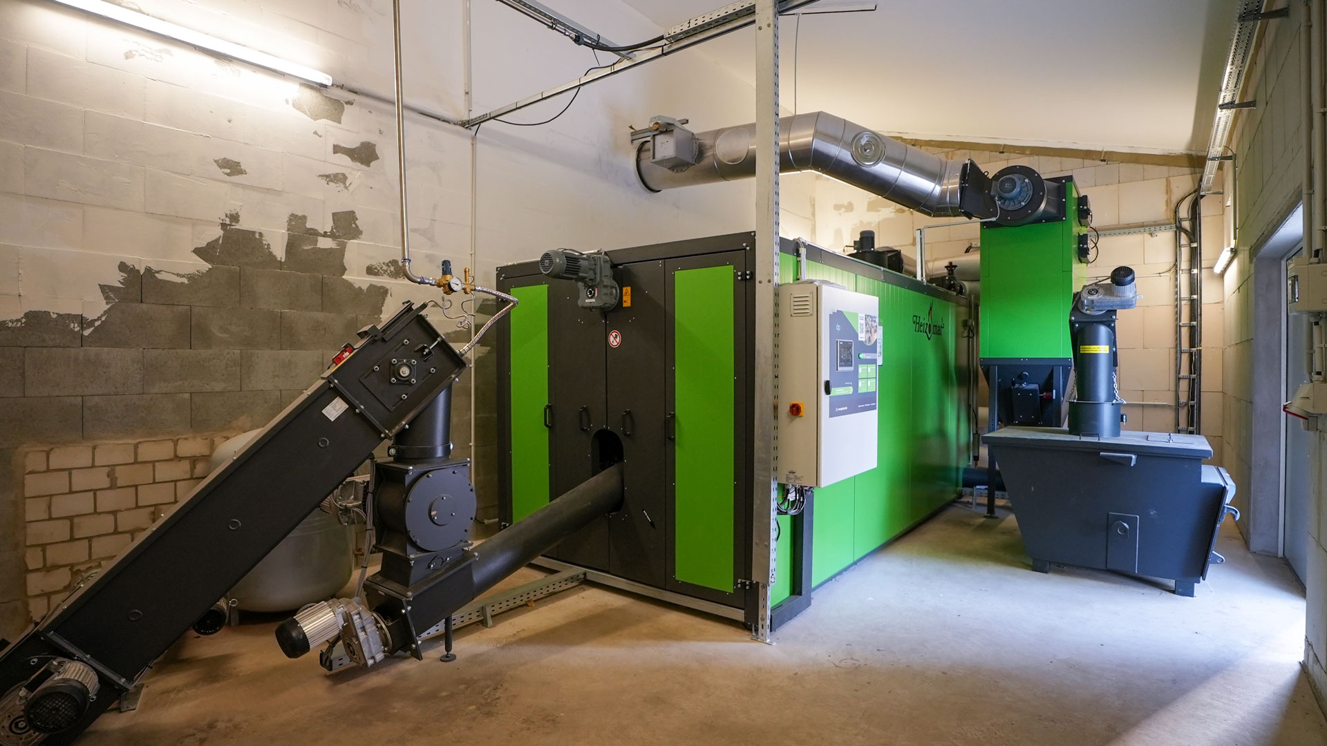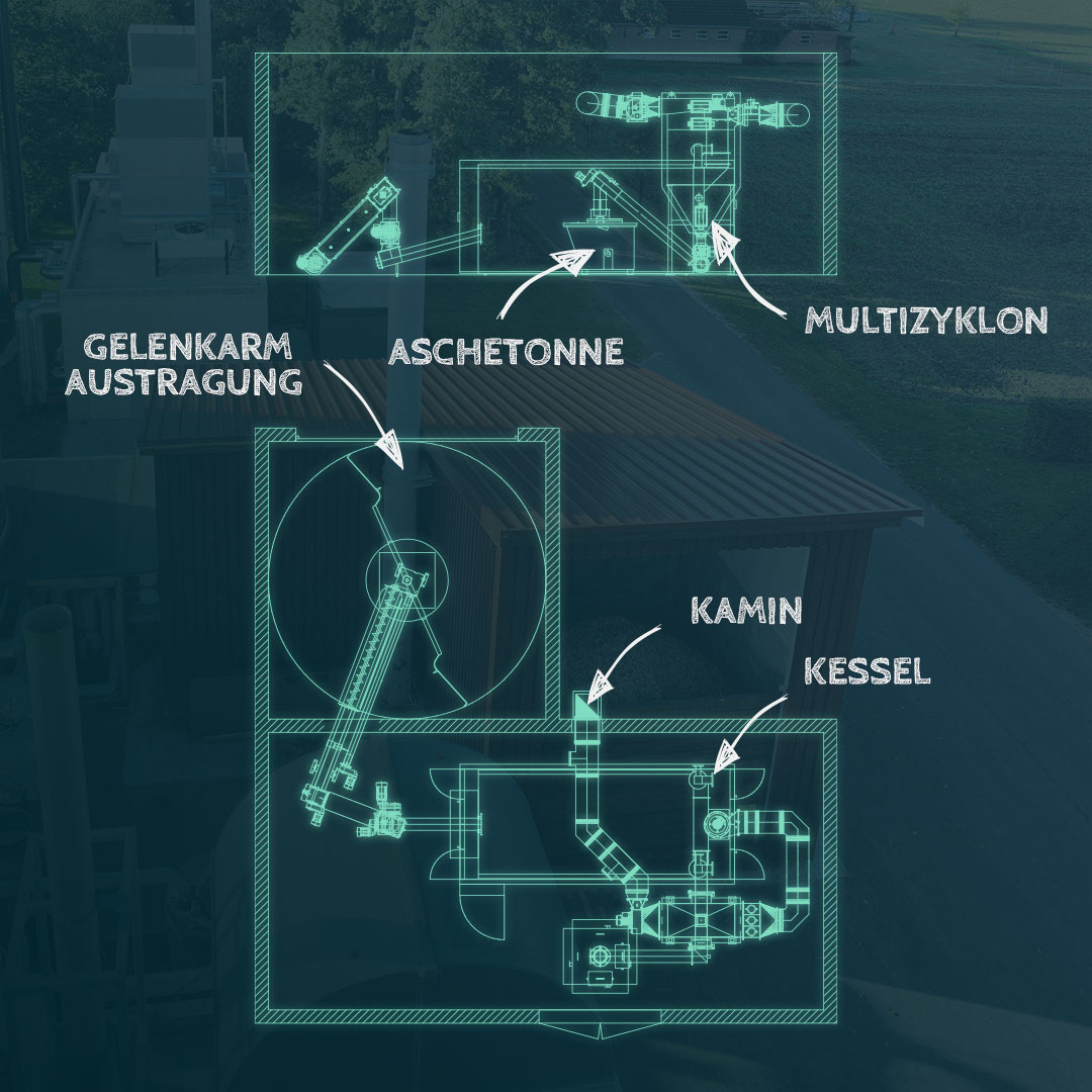 Die neu errichtete Heizzentrale mit anliegendem Brennstoffbunker beherbergt den Kessel, Multizyklon zur Abgasreinigung, den Aschecontainer, sowie die Kaminanlage.