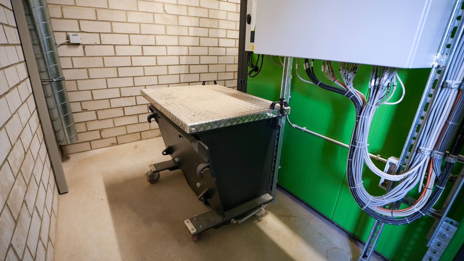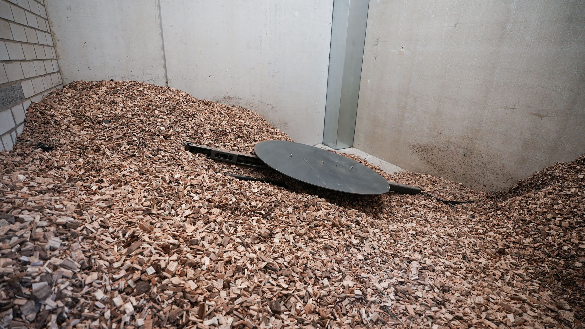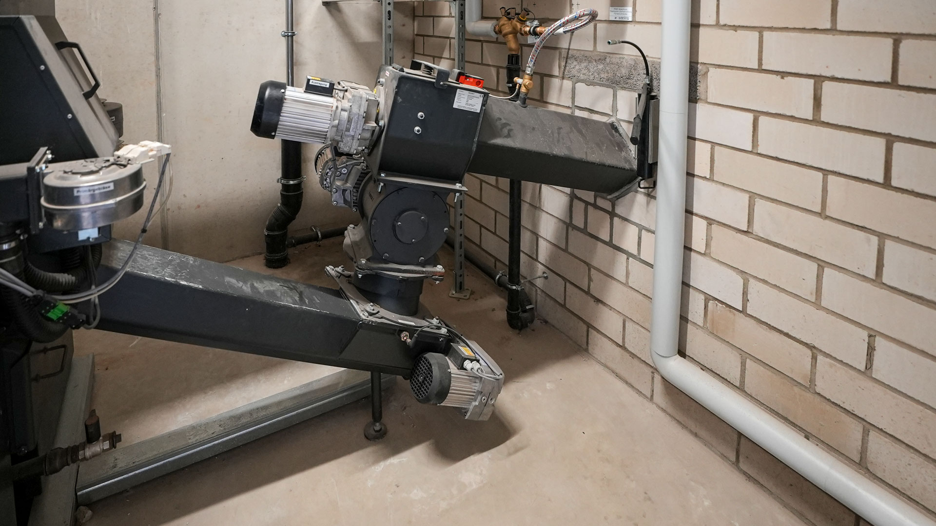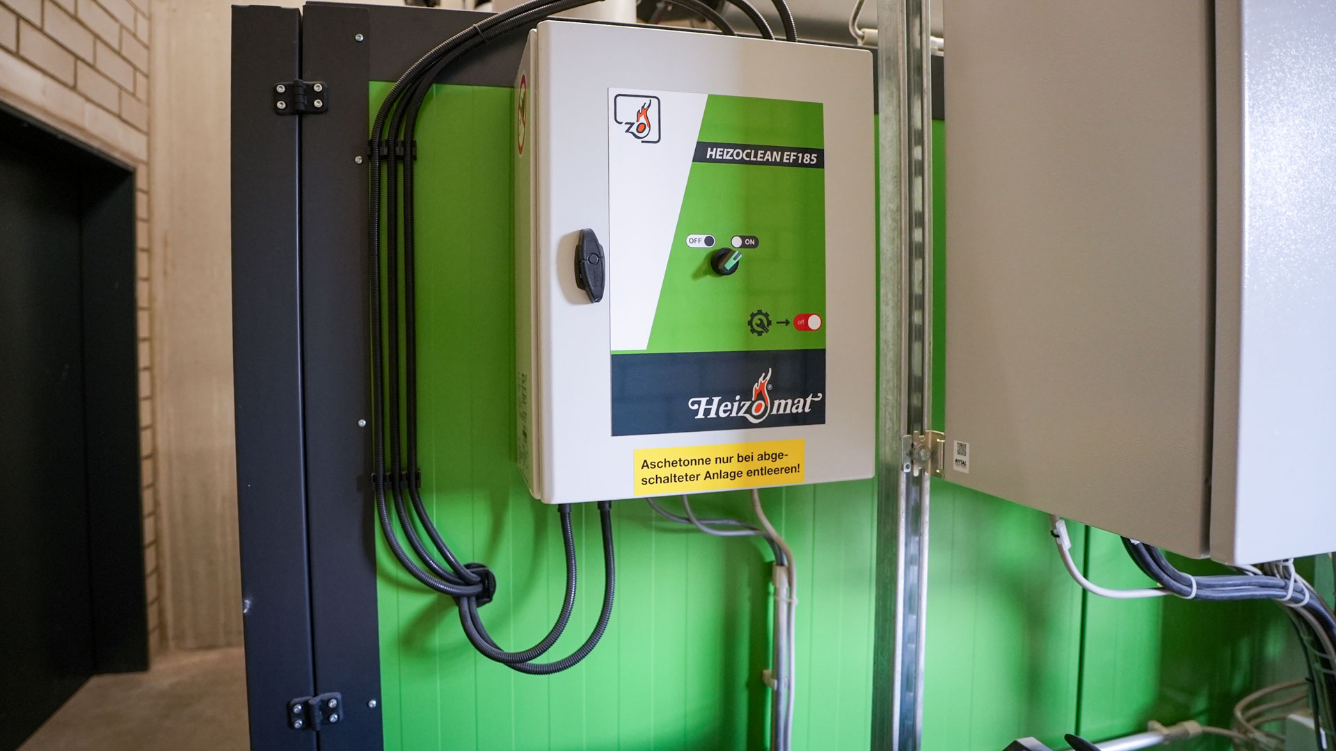 Blick in den Heizraum mit der installierten Heizomat RHK-AK 200P Biomasseheizanlage, Aschecontainer und Steuerung.