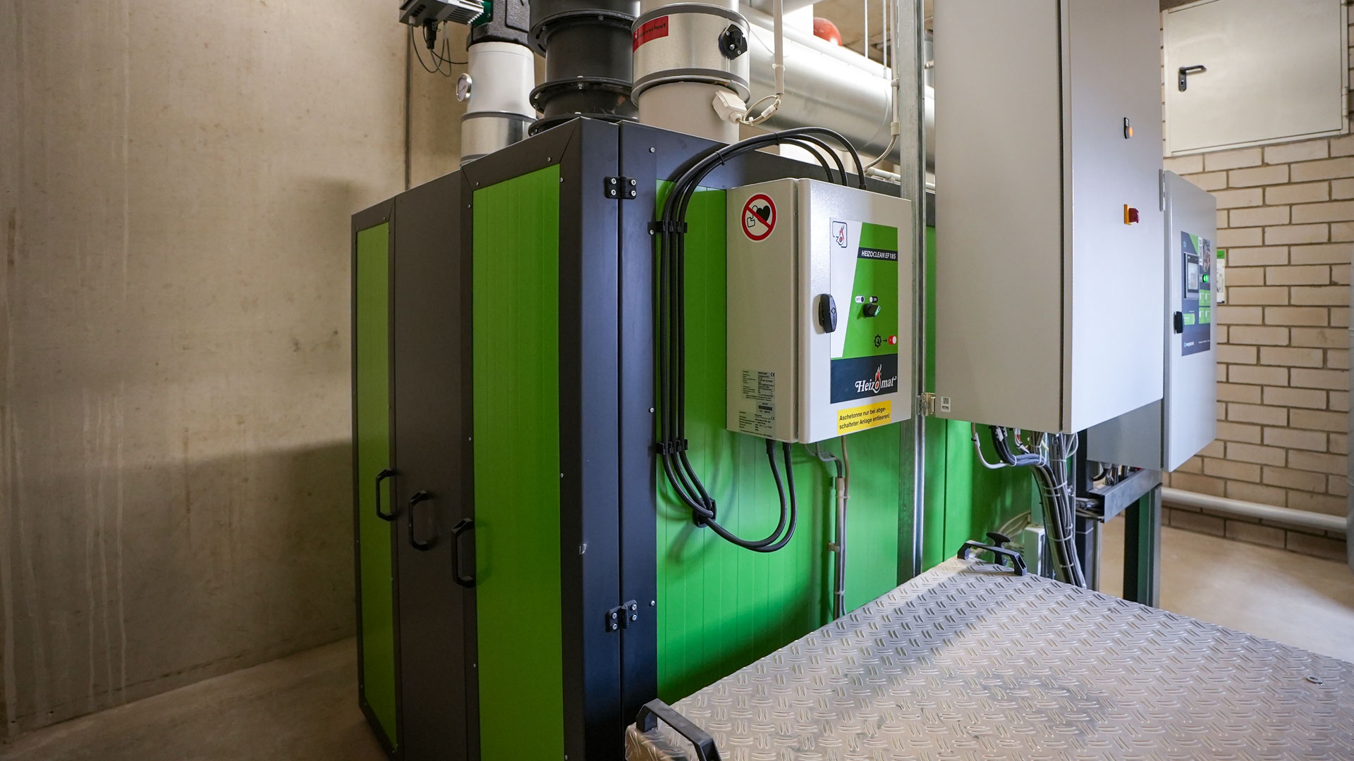Für die Wärmeversorgung kommt eine Heizomat RHK-AK 200P mit 200 kW Nennleistung zum Einsatz. Die Anlage ist für den Dauerbetrieb in Gewerbebetrieben konzipiert und arbeitet vollautomatisch vom Brennstofftransport bis zur Entaschung.