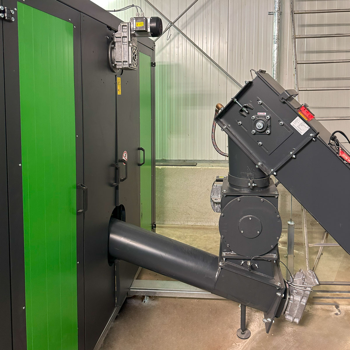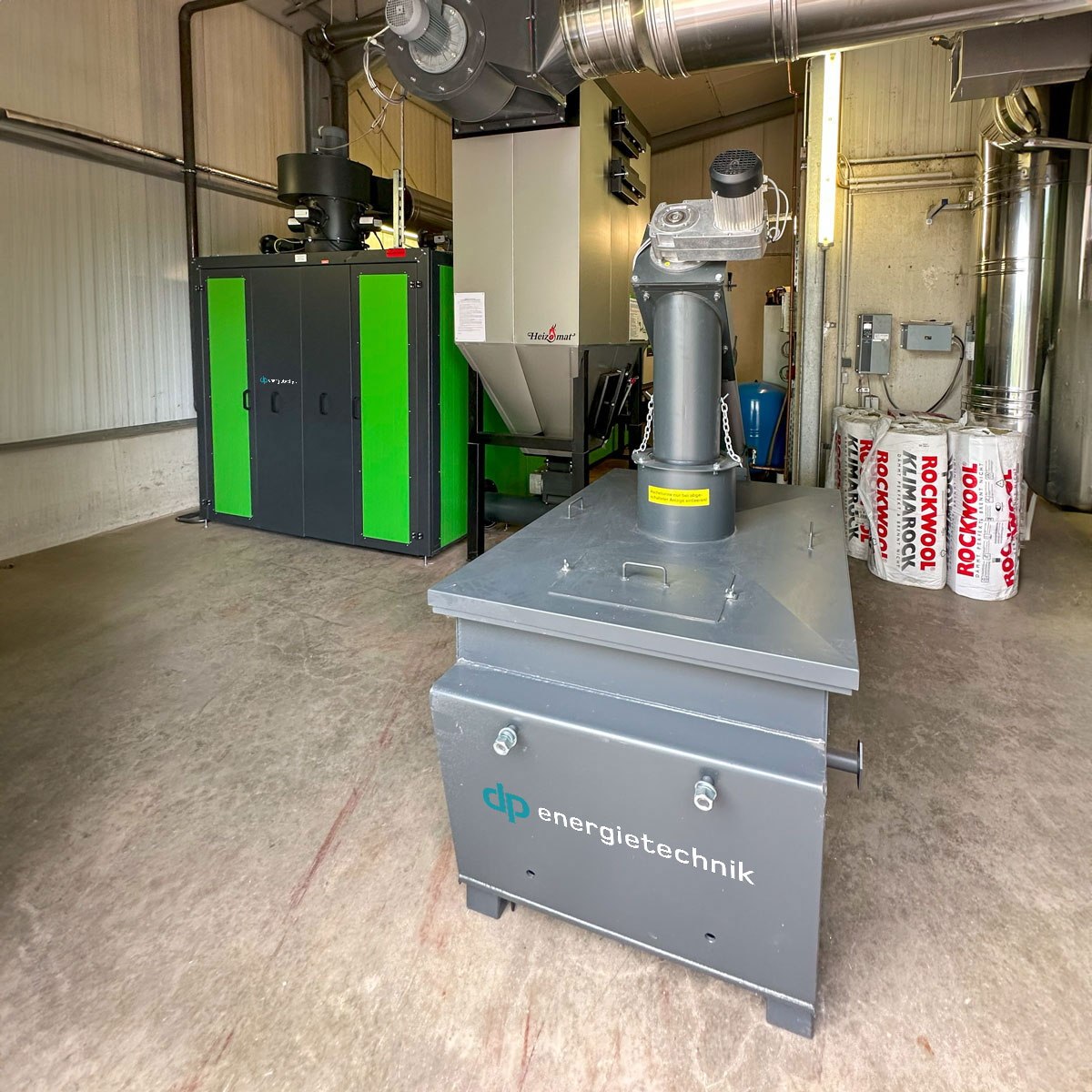 Um den Höhenunterschied von der Austragung zur ZRS zu überbrücken, ist ein Kettenförderer zwischen Austragung und Zellenradschleuse montiert worden. Dieser kann den Brennstoff bis zu einer Steigung von bis zu 45° zur Zellenradschleuse transportieren. Emissionstechnik wie Multizyklon und elektrostatischer Partikelabscheider filtern feste Bestandteile und Rußpartikel aus den Rauchgasen ab.