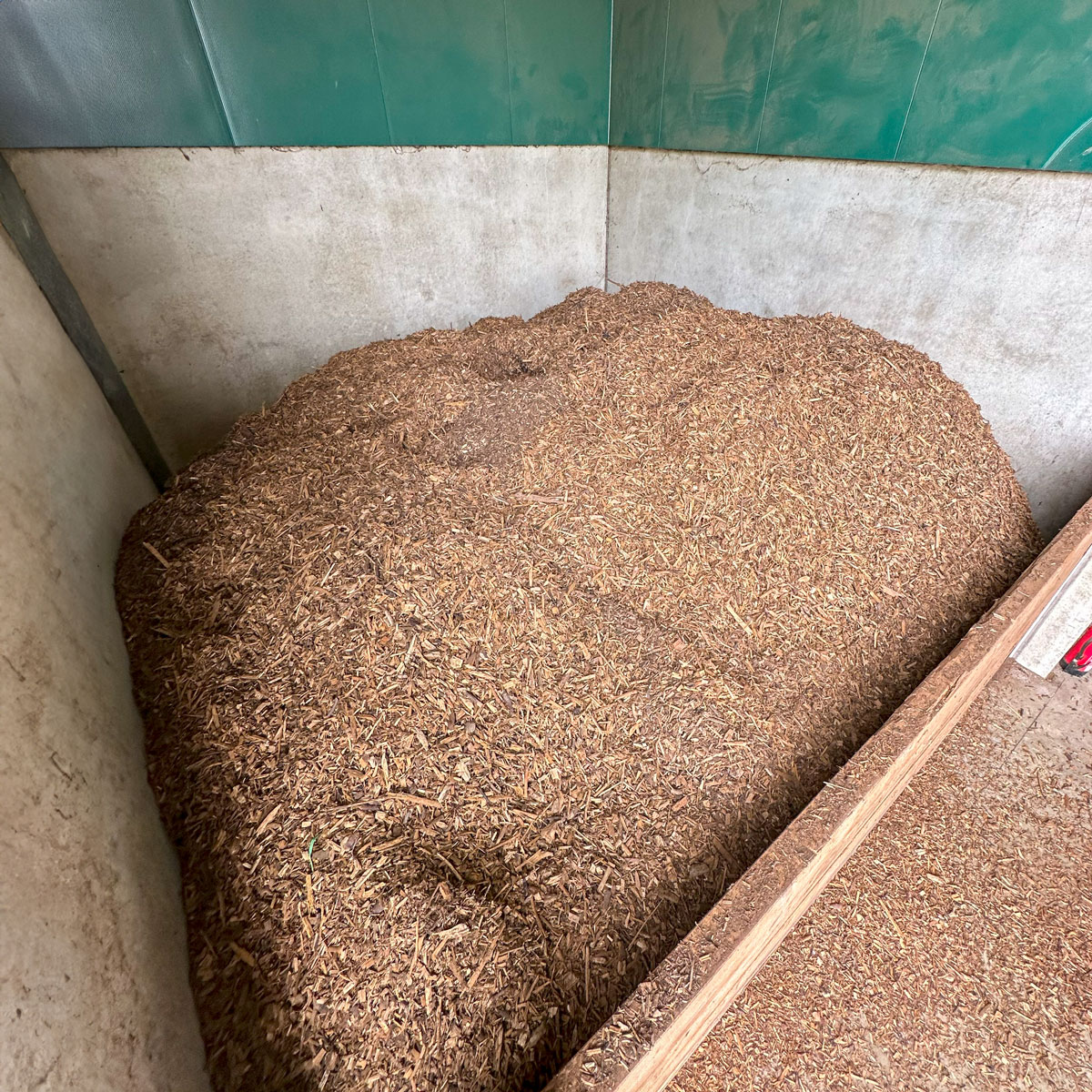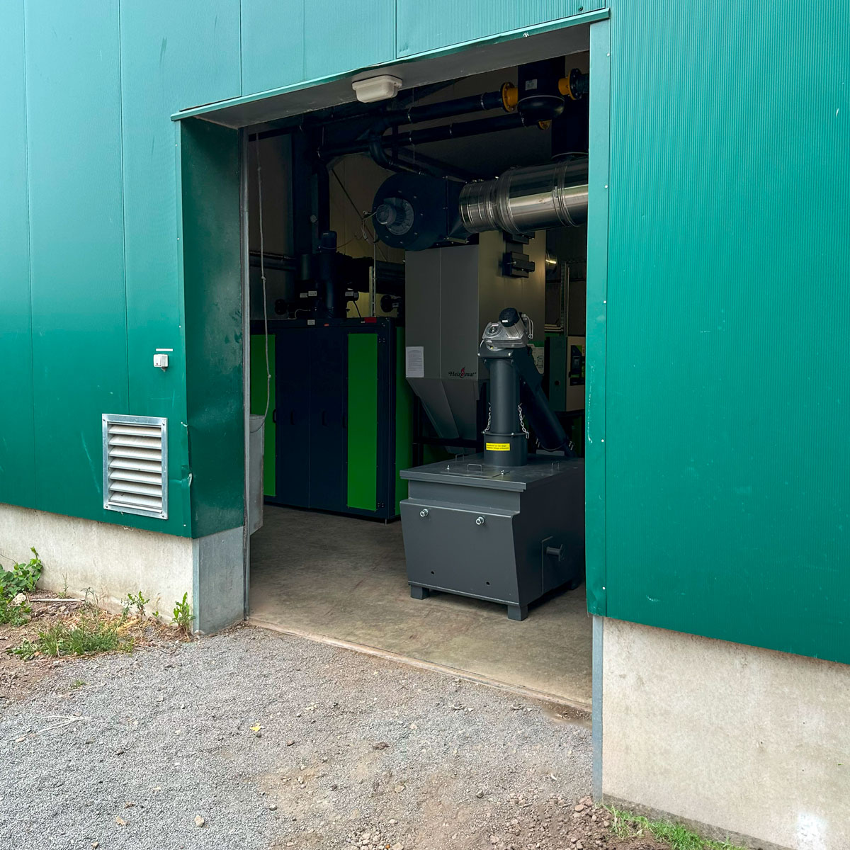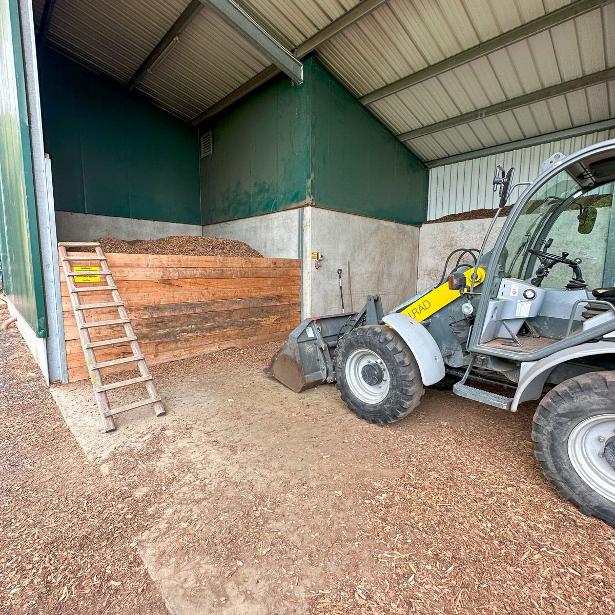 Der Brenstoff kann bequem mit einem Radler vom Lager in den Bunker eingebracht werden. Die Brennstofflagerung unter Dach und auf einer Betonplatte ist ideal dafür