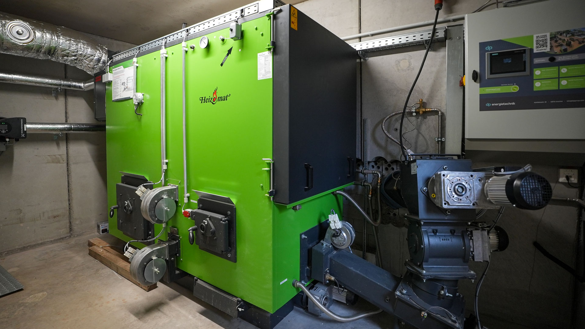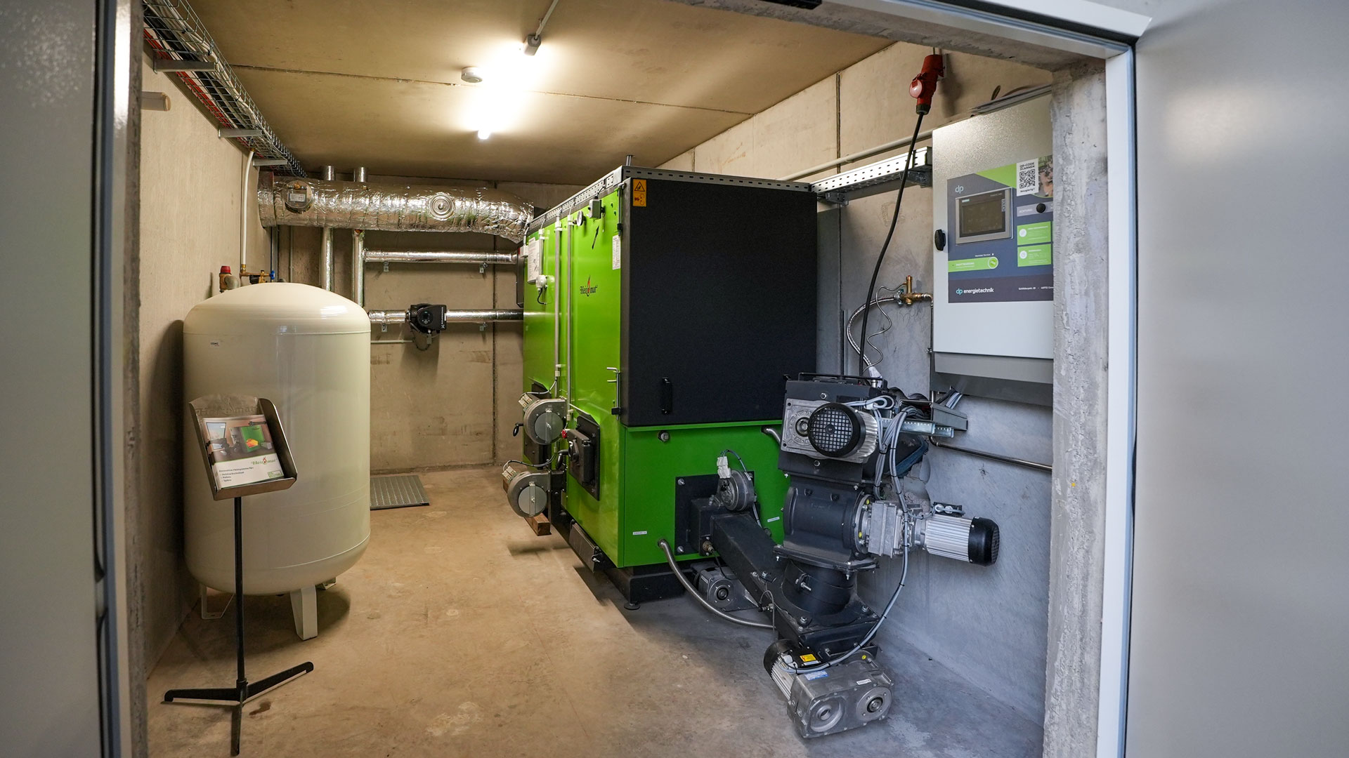 Für den Neubau des Kälberstalls wurde ein komplett neuer Heizraum nach Planung der dp Energietechnik errichtet. Dieser erfüllt die Brandschutzanforderungen F90, da die Anlage über 50 kW Nennwärmeleistung liegt. Direkt angrenzend befindet sich der Brennstoffbunker, der auf gleichem Höhenniveau liegt und damit kurze Wege sowie optimale Befüllung ermöglicht.