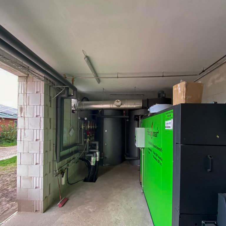Das Biomasse-Heizsystem hat eine Nennwärmeleistung von beeindruckenden 200 kW, was sicherstellt, dass der Wärmebedarf des Betriebs zuverlässig gedeckt wird. Es handelt sich um ein modernes System, das effizient und zuverlässig arbeitet, um die rauen Anforderungen des landwirtschaftlichen Betriebs zu erfüllen. Durch Nahwärmeleitungen werden Sauenställe, Ferkelaufzuchtställe und ein Wohnobjekt versorgt.