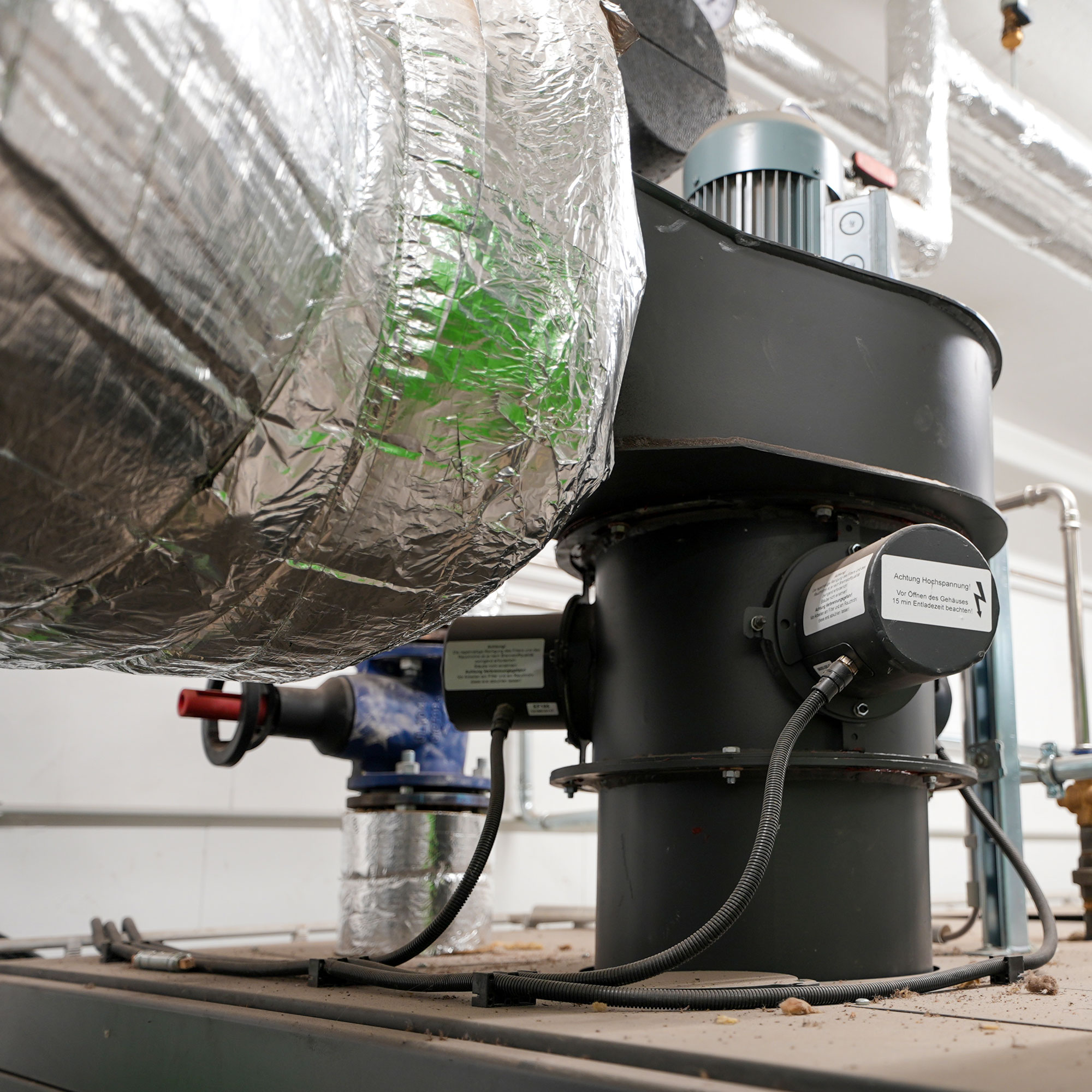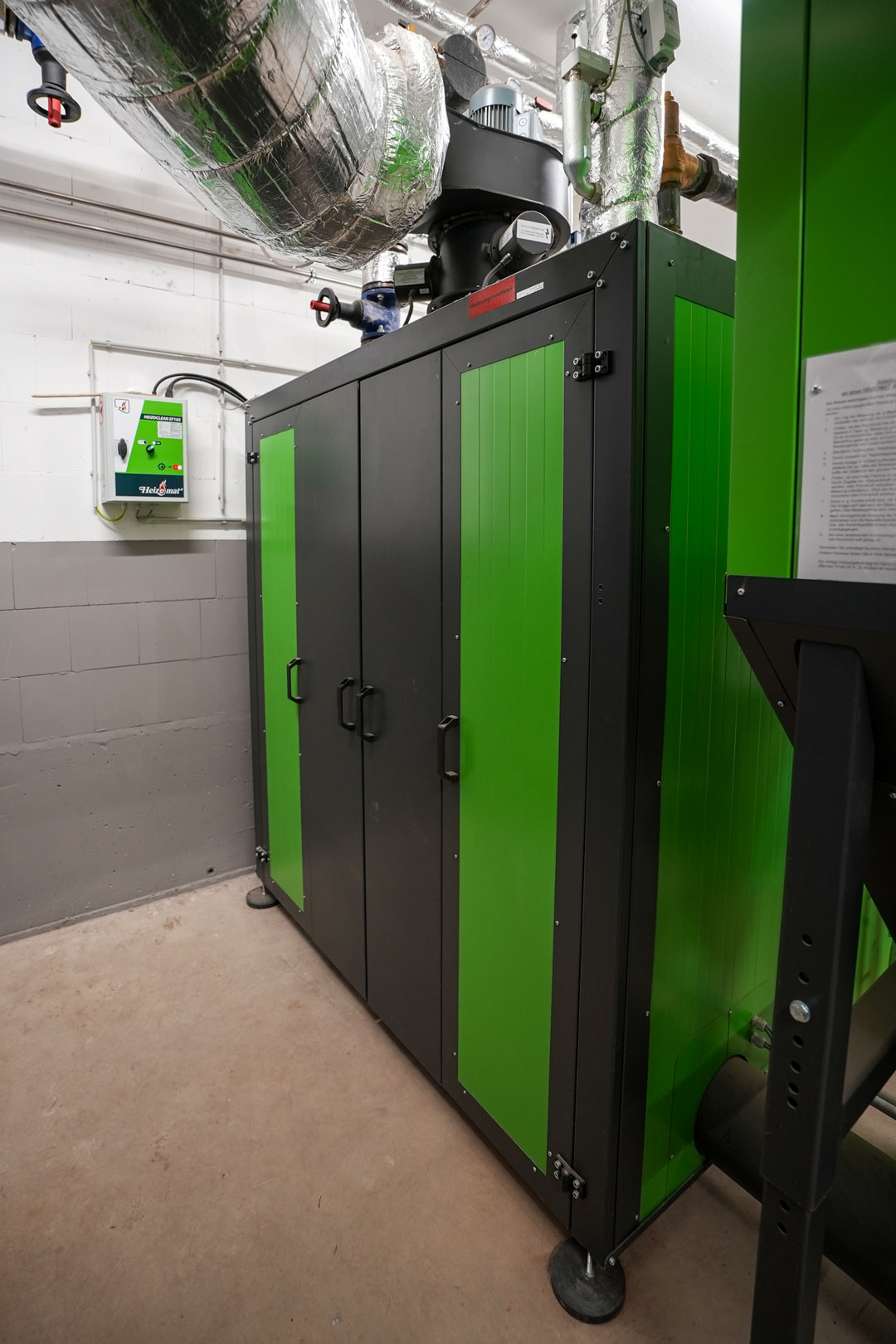 Blick in die Heizzentrale mit RHK-AK Kessel, Abgaswärmetauscher, Multizyklon, Aschecontainer und Steuertechnik.