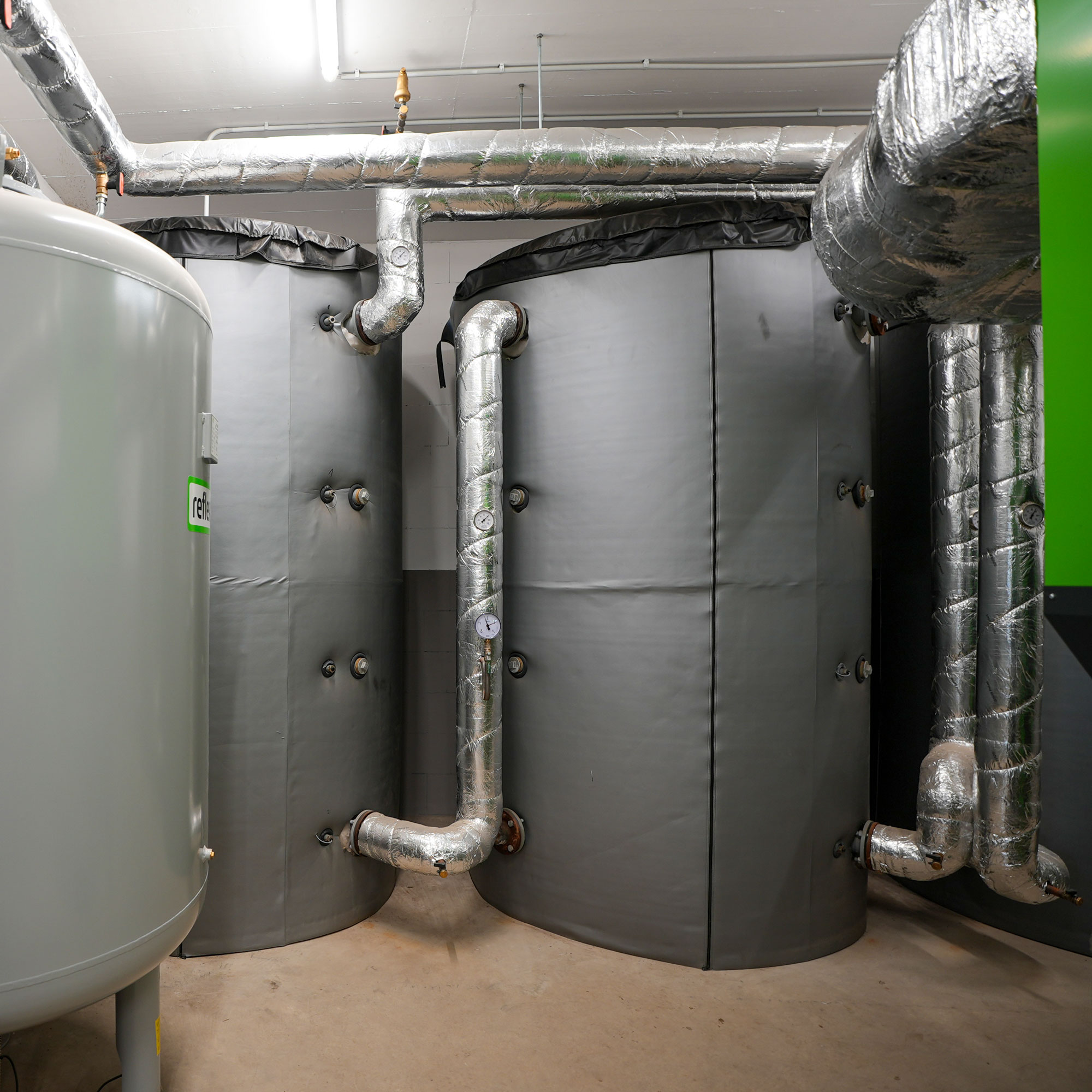 Der Edelstahlkamin wird außen am Gebäude mit Mefa-Profilen montiert. Die Pufferspeicher wurden bei der Planung der Heizzentrale mit dem Kessel gemeinsam installiert. Zur Emissionsreduktion sind ein Multizyklon als Grobascheider und der Heizoclean Feinstaubabscheider integriert, die Staubpartikel aus dem Abgas filtern und ausgezeichnete Abgaswerte gewährleisten.