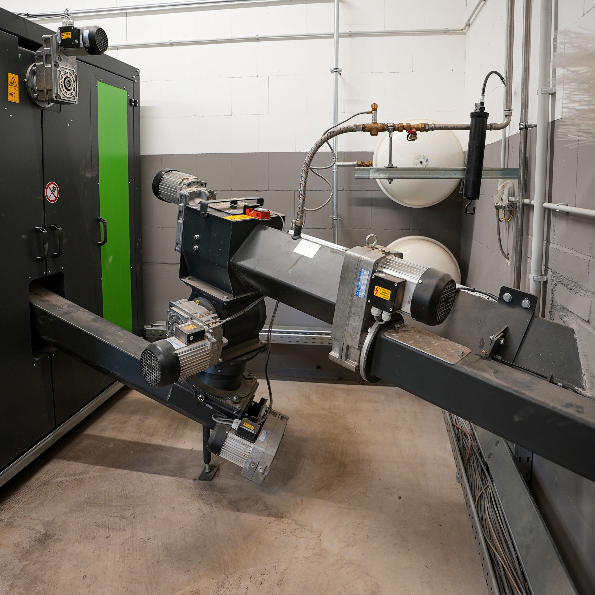 Die Heizungsanlage wurde gemäß den Brandschutzvorschriften in einem neu errichteten Heizraum innerhalb einer ebenfalls neu gebauten Halle installiert. Neben dem Heizraum entsteht auch ein neuer Bunker an der Stirnseite. Eine Bunkerfräse mit 5 Metern Durchmesser sorgt für die Raumaustragung der Hackschnitzel zum Kessel. Die Befüllung des Brennstoffbunkers erfolgt bequem von der Stirnseite aus mit einem Frontlader.