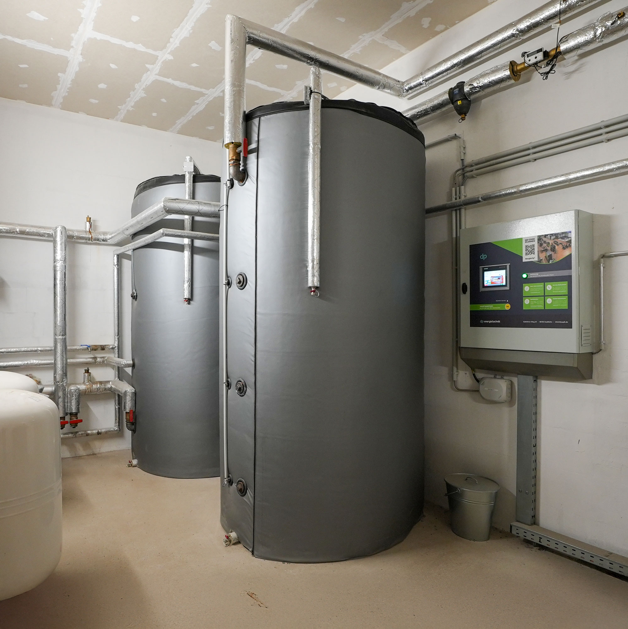 Die Heizungsanlage wurde mit einem Sicherheitswärmetauscher ausgestattet, um höhere Vorlauftemperaturen von bis zu 95° zu ermöglichen und somit die Heizleistung der angeschlossenen Wohnhäuser und der Getreidetrocknung zu optimieren. Durch die Integration von zwei Pufferspeichern mit jeweils 3.000 Litern wird eine zuverlässige Wärmeversorgung gewährleistet, auch wenn die Trocknungsanlage ausschließlich im Sommer betrieben wird.